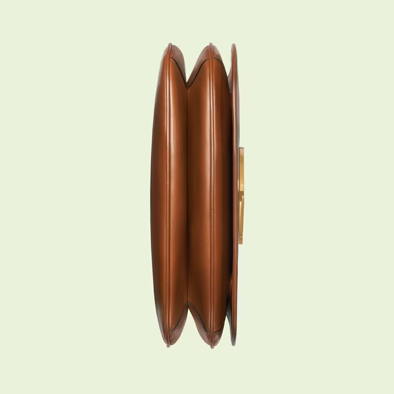 Coming from the Houses archives, a geometrically shaped version of the Interlocking G logo is reintroduced for Luxury Love Parade. The emblem enriches the design with a timeless feel—mirroring the Hollywood glamour that shaped the fashion show. This medium-sized version of the accessory is presented in brown leather.