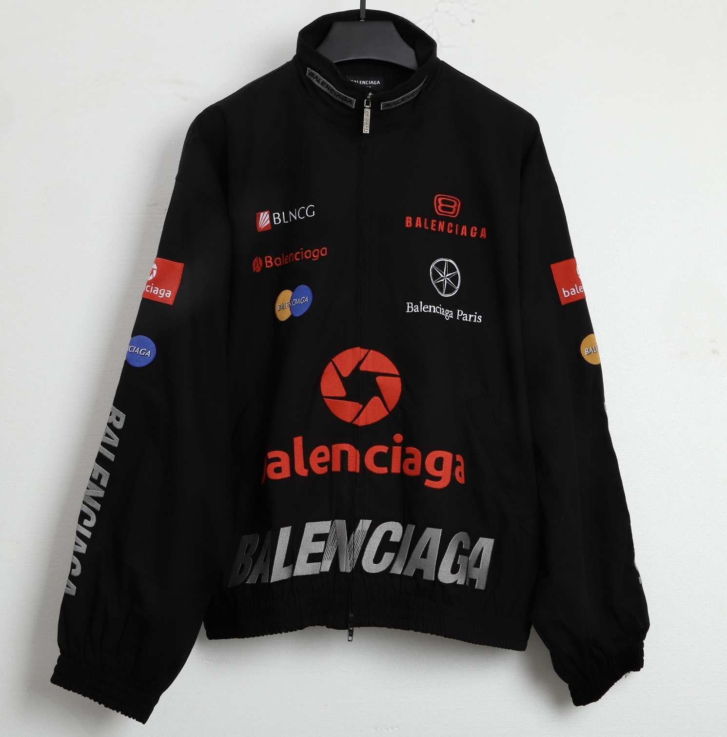 • USsize, high stand-up collar, zip closure, 2 zippered diagonal pockets, matching color rolled edges, elastic cuffs and waist, adorned with artistic prints on the chest and front.
