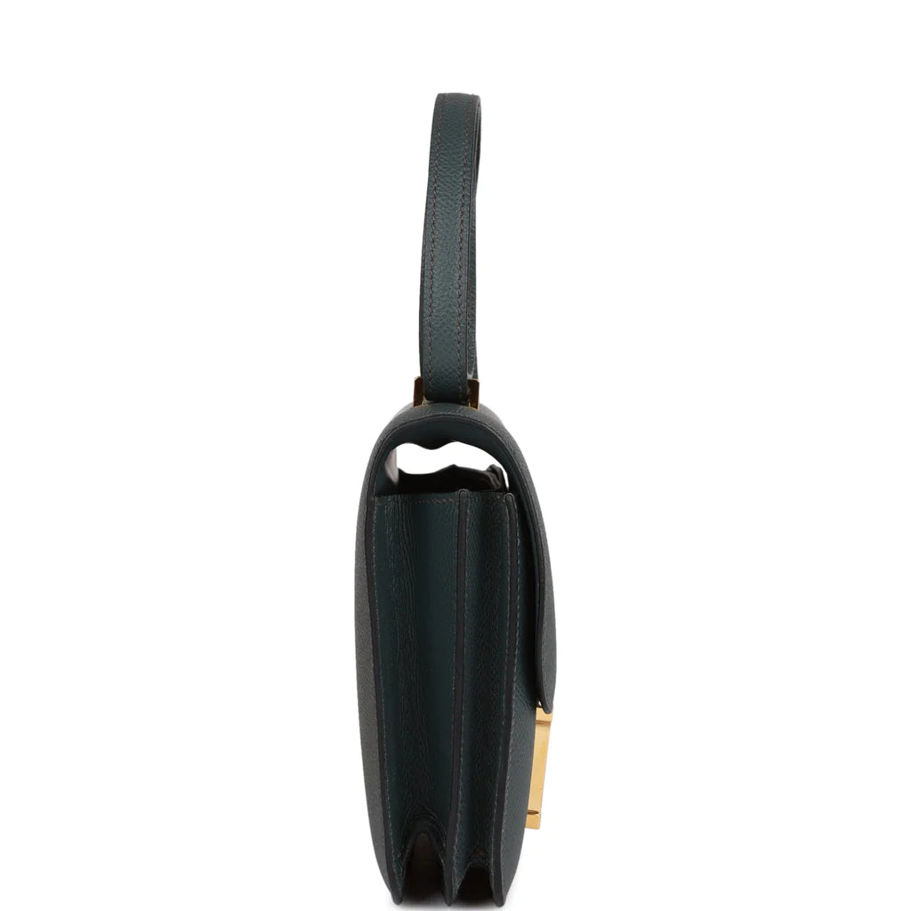 This Constance is in Bleu Orage epsom leather with gold hardware and has tonal stitching, a metal “H” snap lock closure and adjustable shoulder strap.