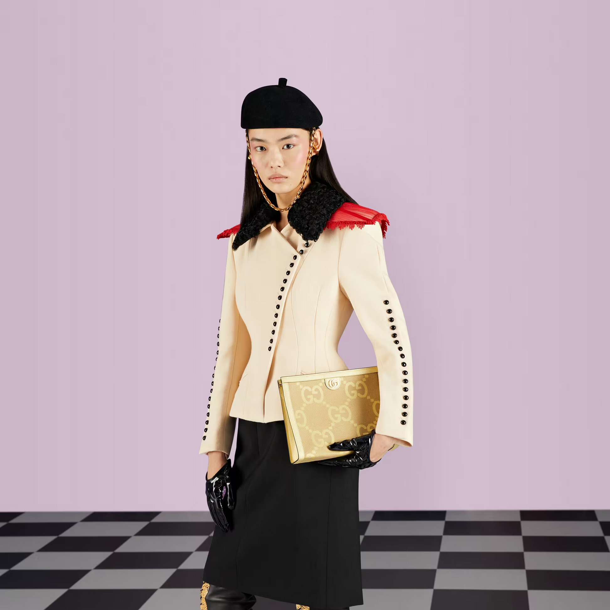 The Double G has remained one of the most symbolic codes of the House since its introduction. Here, it appears atop this structured canvas pouch, enriched with a fresh color palette. Completing the designs logo feel, the style is crafted from Tote canvas with the motif appearing in a malist, jumbo-sized version.