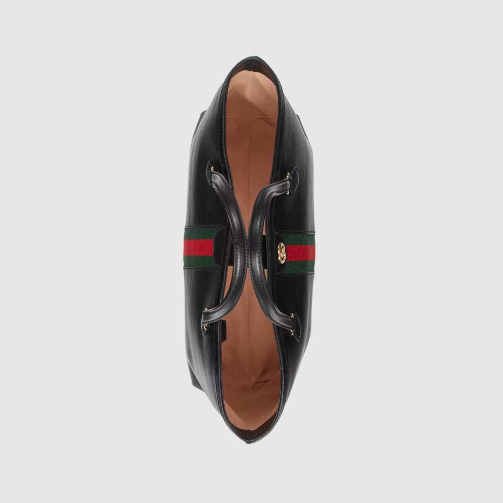 Enriched with details, the world of expands with the introduction of a black leather tote. With a softly structured silhouette, the bag pairs two archival details as a tribute to the origins of the House. The Double G is a reference to Luxury o Luxury s Tote while the green and red Web stripe is a celebration of the brands equestrian roots.
