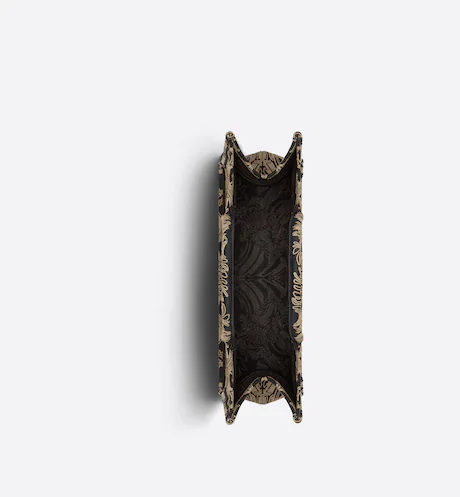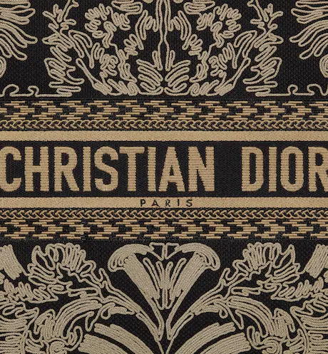 Introduced by Maria Grazia Chiuri, Diors Creative Director, the Dior Book Tote has become a staple of the Dior aesthetic. Designed to hold all the daily essentials, the style is fully embroidered in a black and beige Ornamental motif with a Cornely effect, inspired by Andalusian baroque in a graphic spirit. The design is adorned with the CHRISTIAN DIOR PARIS signature on the front and exemplifies the Houses signature savoir-faire. The large tote may be carried by hand or worn over the shoulder.