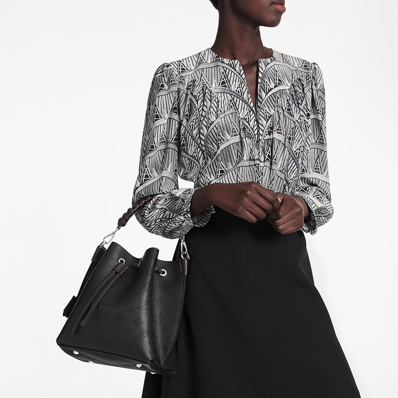 The Muria bucket Bag is made from Mahina calf, a perforated leather with a discreet Tote motif. Supple and sophisticated, it is a pleasure to carry, either by the braided top handle or the long leather strap, which adjusts for short- and long-shoulder or hands-free cross-body wear. Crafted signature details include a name tag and keybell in smooth .