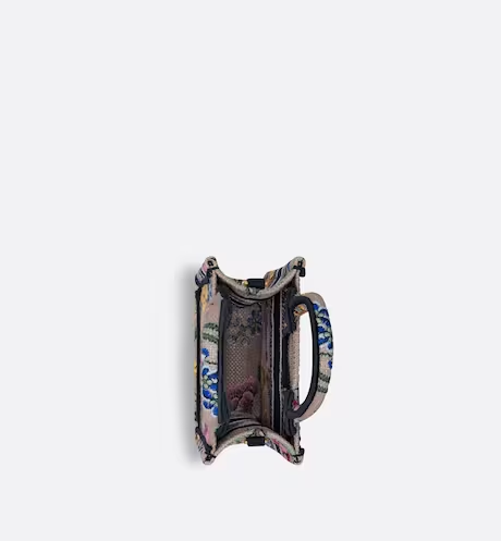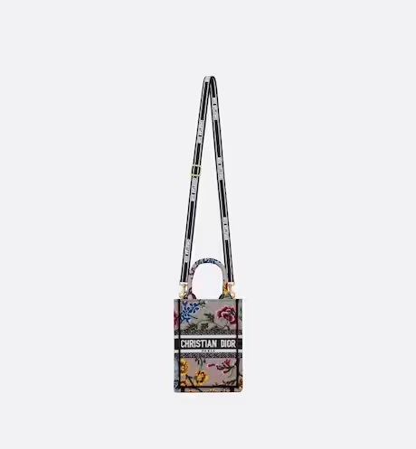 The phone bag enhances the iconic Dior Book Tote line with an ideal example of the Houses savoir-faire. The style is entirely embroidered with the pink and multicolor Dior Petites Fleurs motif, a romantic and vibrant homage to Mr. Diors passion for florals. Embellished with the Christian Dior Paris signature on the front, the miniature bag can accommodate a phone as well as the small daily essentials. Completed by an adjustable and removable embroidered shoulder strap, the modern accessory can be carried by hand, worn over the shoulder or crossbody.