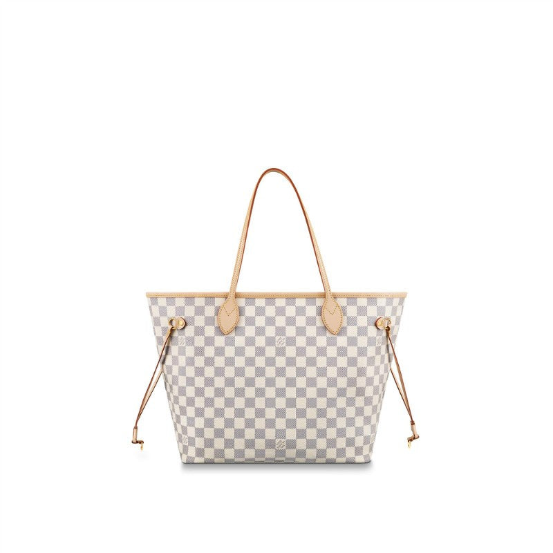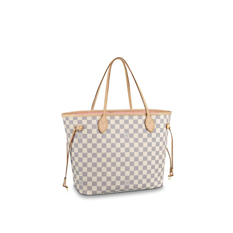 The bag tote unites timeless design with heritage details. Made from fresh Damier Azur canvas with natural cowhide trim, it is roomy yet not bulky, with side laces that cinch for a sleek allure or loosen for a casual look. The slim leather handles slip easily over the shoulder or arm. Lined in colorful textile, it features a removable totewhich can be used as a clutch or an extra pocket.