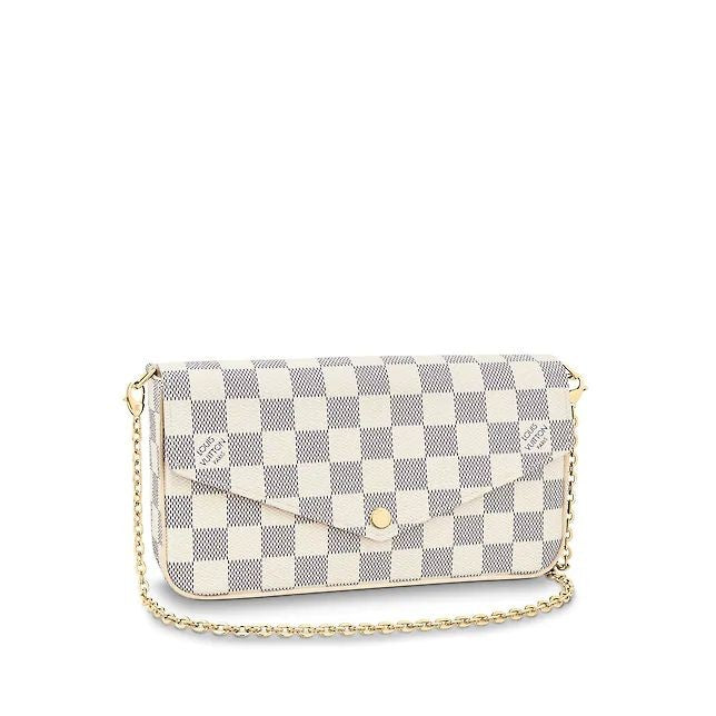 With its two removable interior pockets, the elegant Felicie in Damier Azur canvas is the stylish solution to carry and organise all your daily essentials. Much more than a wallet, it can be transformed into a glamourous shoulder bag or clutch thanks to its removable golden chain.