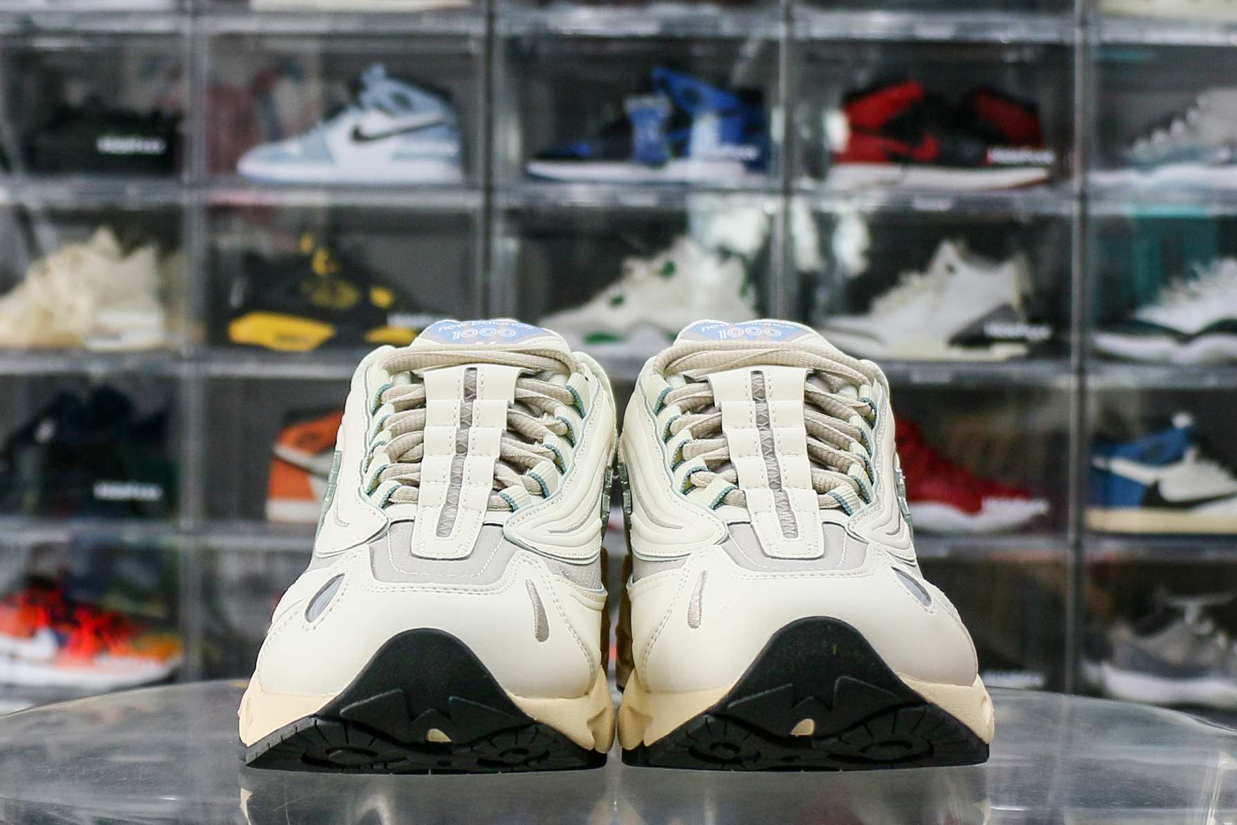 • The New Balance 1000 Angora Moonrock rolls out a grey knit upper with off-white leather overlays. The neutral tones are offset by a see-through N logo piped in green, along with dusty blue accents on the heel. A cream-colored foam midsole includes ABZORB cushioning in the forefoot and heel areas.