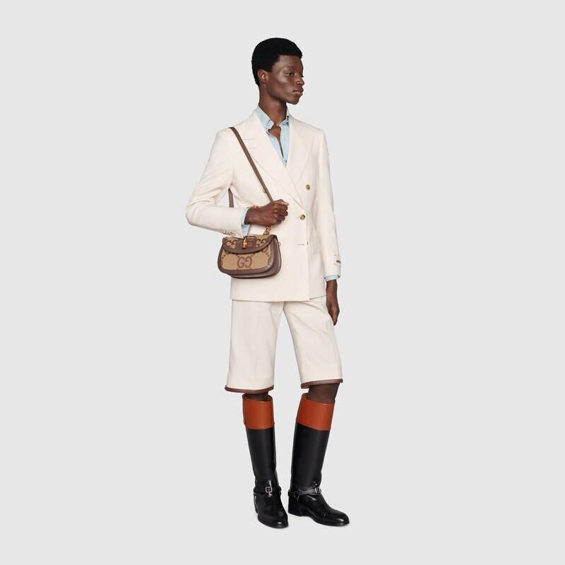 The brands logo is reinterpreted in a different way each season. The “Aria-Fashion Aria” series introduces a newly designed double G pattern with a dazzling style. This small bag features a bamboo handle that brings a modern twist to a material.