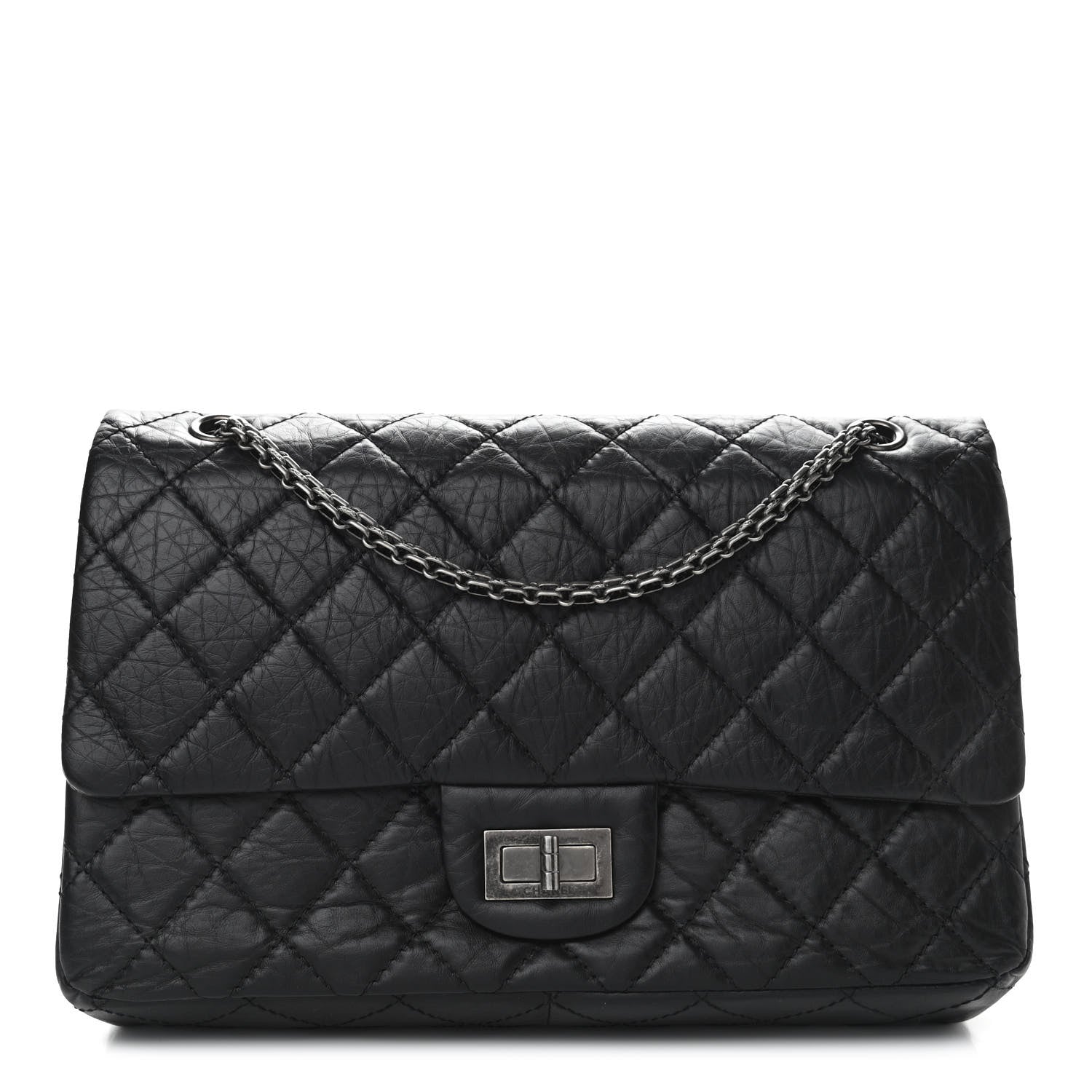 This is an authentic Aged 2.55 Reissue 226 Flap in Black. This stylish shoulder bag is crafted of aged diamond-leather in black. The bag features ruthenium reissue shoulder strap. and a matching mademoiselle turn lock on the crossover flap. The bag opens to reveal an inner flap. a front pocket. and burgundy leather interior with patch pockets.