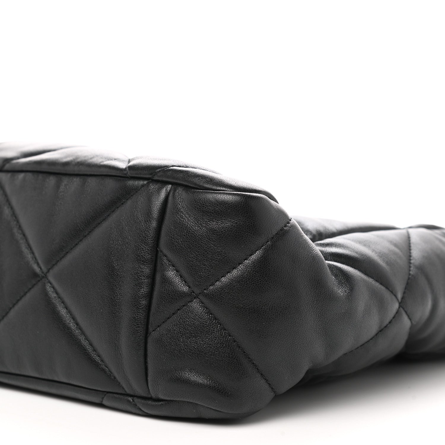 This is an authentic Lambskin Quilted 19 Shopping Bag in Black. This stylish handbag is crafted of diamond-quilted calfskin leather in black. The bag features leather threaded chain shoulder straps and a matching logo on the front. The open top with magnetic closure leads to a red fabric interior with a pocket.